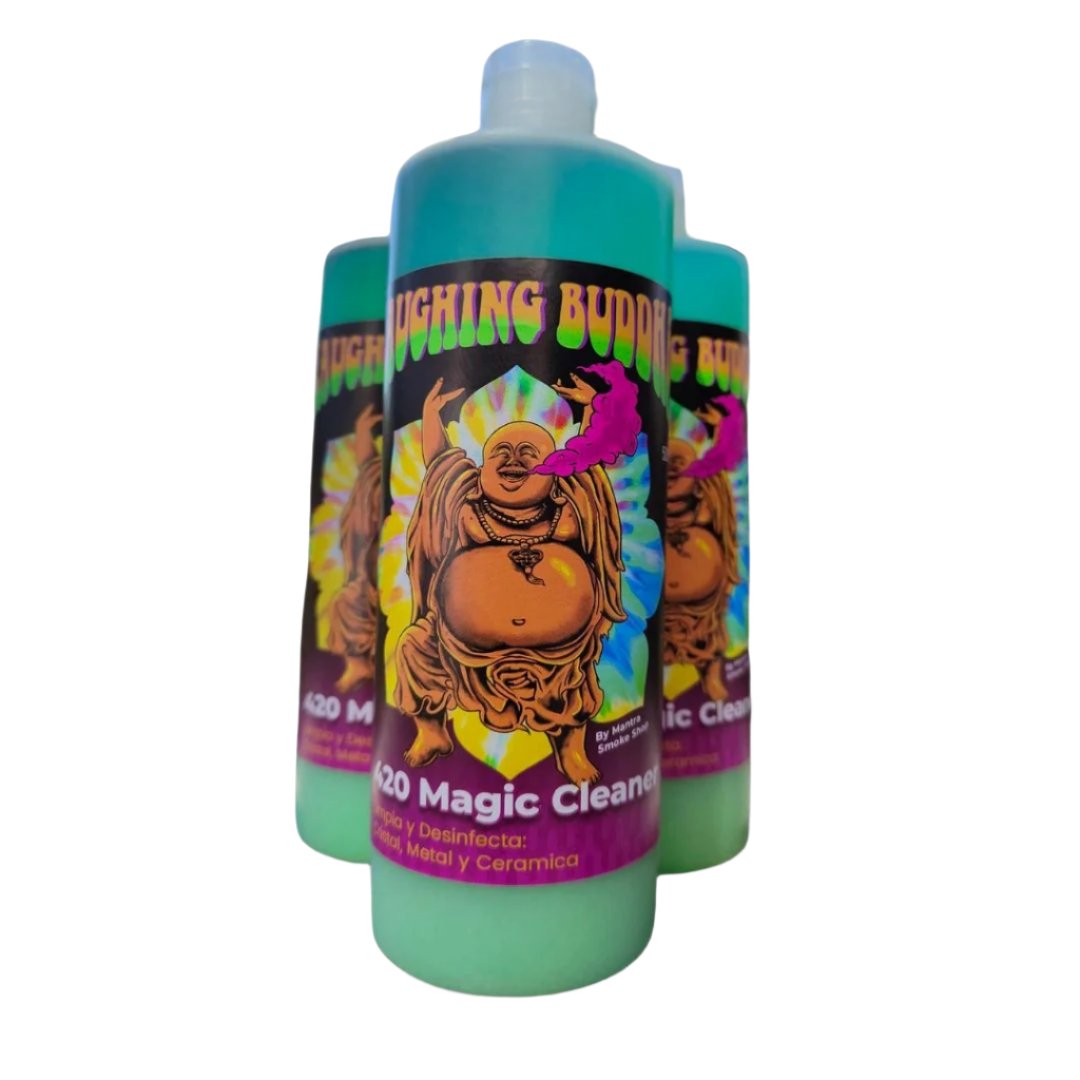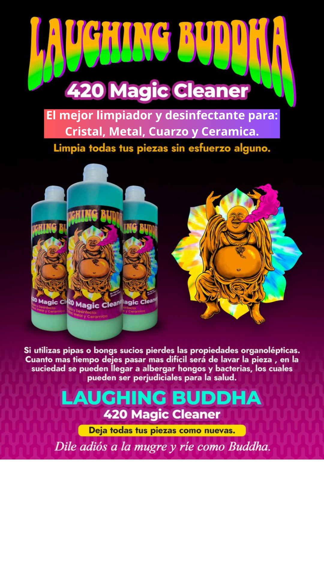 LAUGHING BUDDHA 420 Magic Cleaner el mejor limpiador y desinfectante para: cristal, metal,cerámica y cuarzo. Limpia todas tus piezas sin esfuerzo alguno. Si utilizas pipas o bongs sucios pierdes las propiedades organolépticas, Cuanto más tiempo dejes pasar, más difícil será de lavar la pieza, en la suciedad se pueden llegar a albergar hongos y bacterias, los cuales pueden ser perjudiciales para la salud. LAUGHING BUDDHA 420 Magic Cleaner deja todas tus piezas como nuevas. Dile adiós a la mugre y ríe como Buddha. La Compra incluye: 1 Botella de 500 ml de LAUGHING BUDDHA 420 Magic Cleaner.