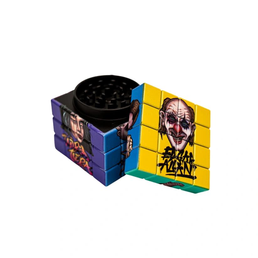 Grinder 4 partes, con forma cuadrada con dientes de cerámica que impiden que tus flores se peguen, con un compartimento para picar y otro para juntar la resina. Esmaltado en colores mate con la cara de nuestros personajes.