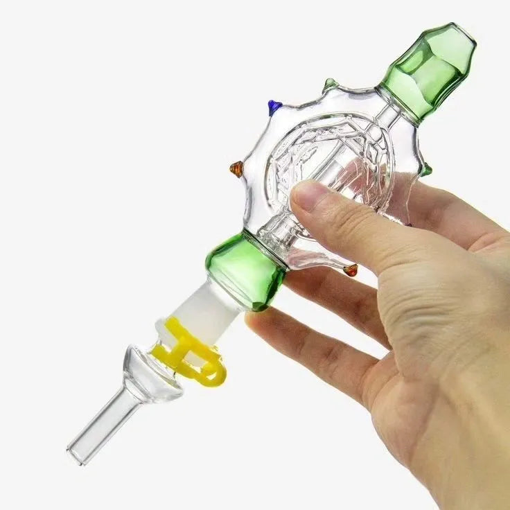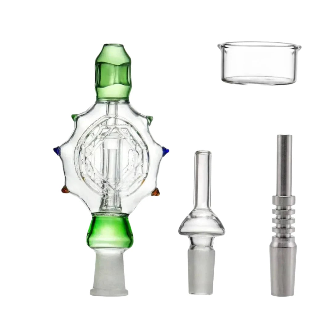 Nectar Collector de alta calidad. Excelente por su portabilidad y disponibilidad. Funciona muy bien al aire libre o en entornos más sociales. Este kit recolector de néctar incluye un filtro de vidrio, una punta de cuarzo, una punta de titanio, un clip y un recipiente para dab. Cuando la uses, puedes elegir una punta de cuarzo o una punta de titanio y luego colocar la cera en el recipiente para dabs. Luego, calienta la punta del recolector de néctar y aplica con el concentrado preparado. En ese momento, podrás ver el vapor desde el filtro de vidrio hacia la cámara de agua y finalmente hasta la boquilla.